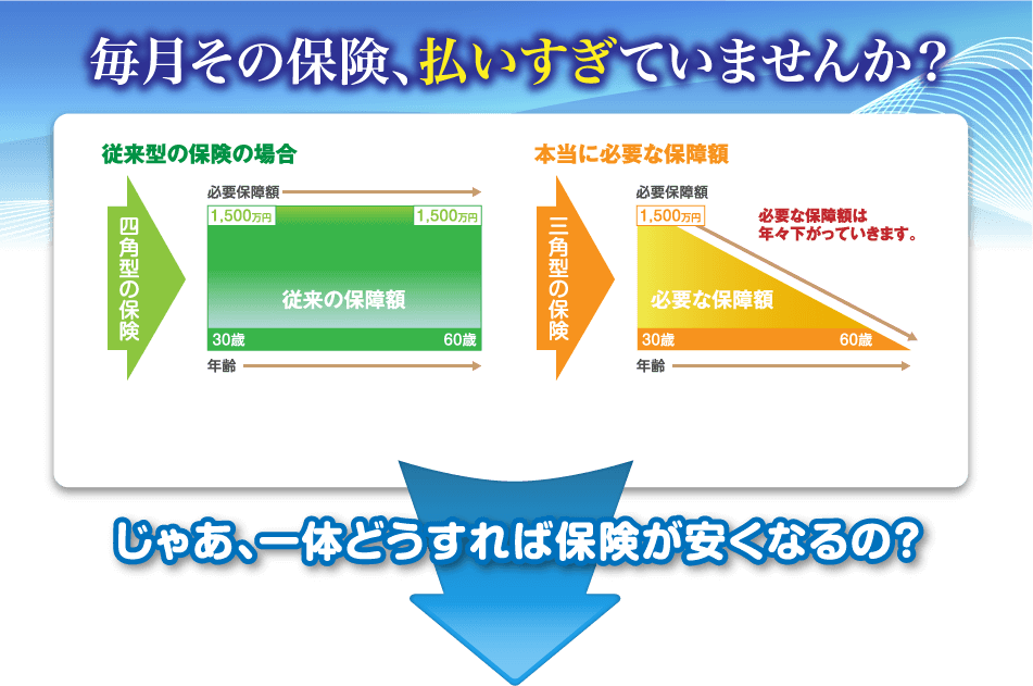 組み合わせ次第で、保険料節約と保障内容のアップ!各社の商品の中から納得できるものを選べる!ということは、それらの中から、ニーズに合ったものだけを組み合わせた、 おいしいとこどりの提案が受けられるということ。 ご利用者の中には、毎月の支払いを節約した上で、保障内容もアップ! なんていう方も決して珍しくないんです。 自社の商品しか扱えない営業担当者では、こうはいきません。 |