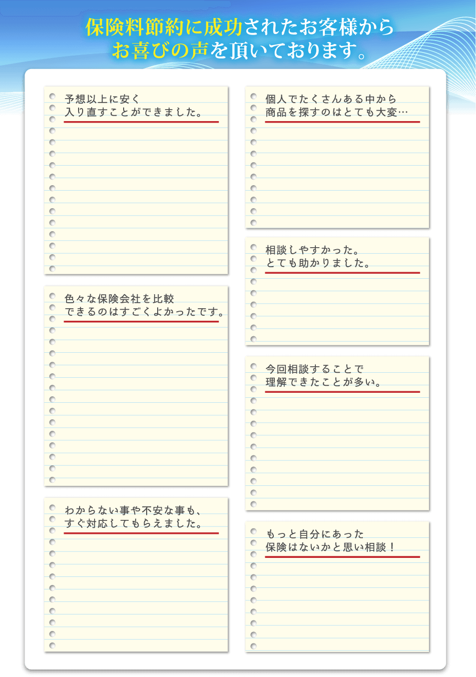保険のチャンスでは、ご相談された方が必要と思われた場合にのみ、保険にご加入いただきます。 万が一、担当FPからしつこい勧誘があった場合はお知らせください。 |